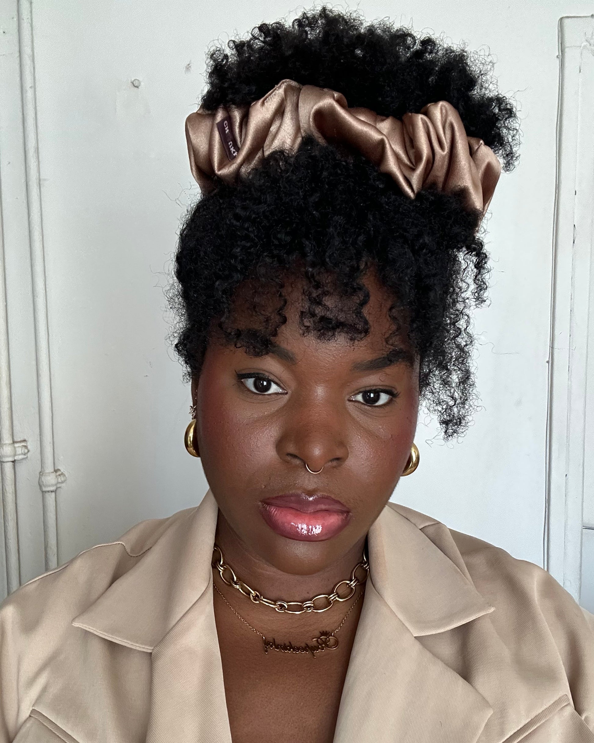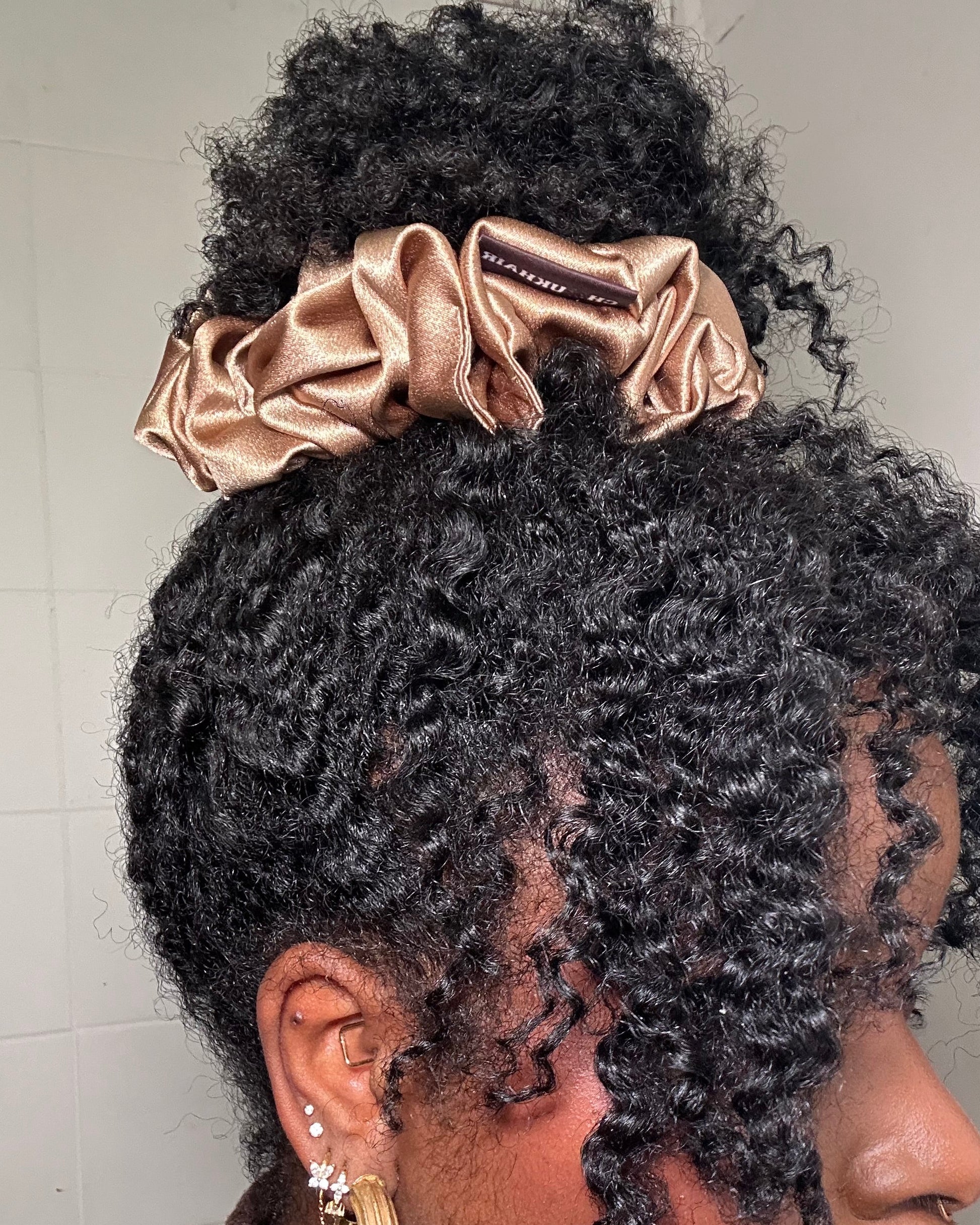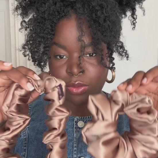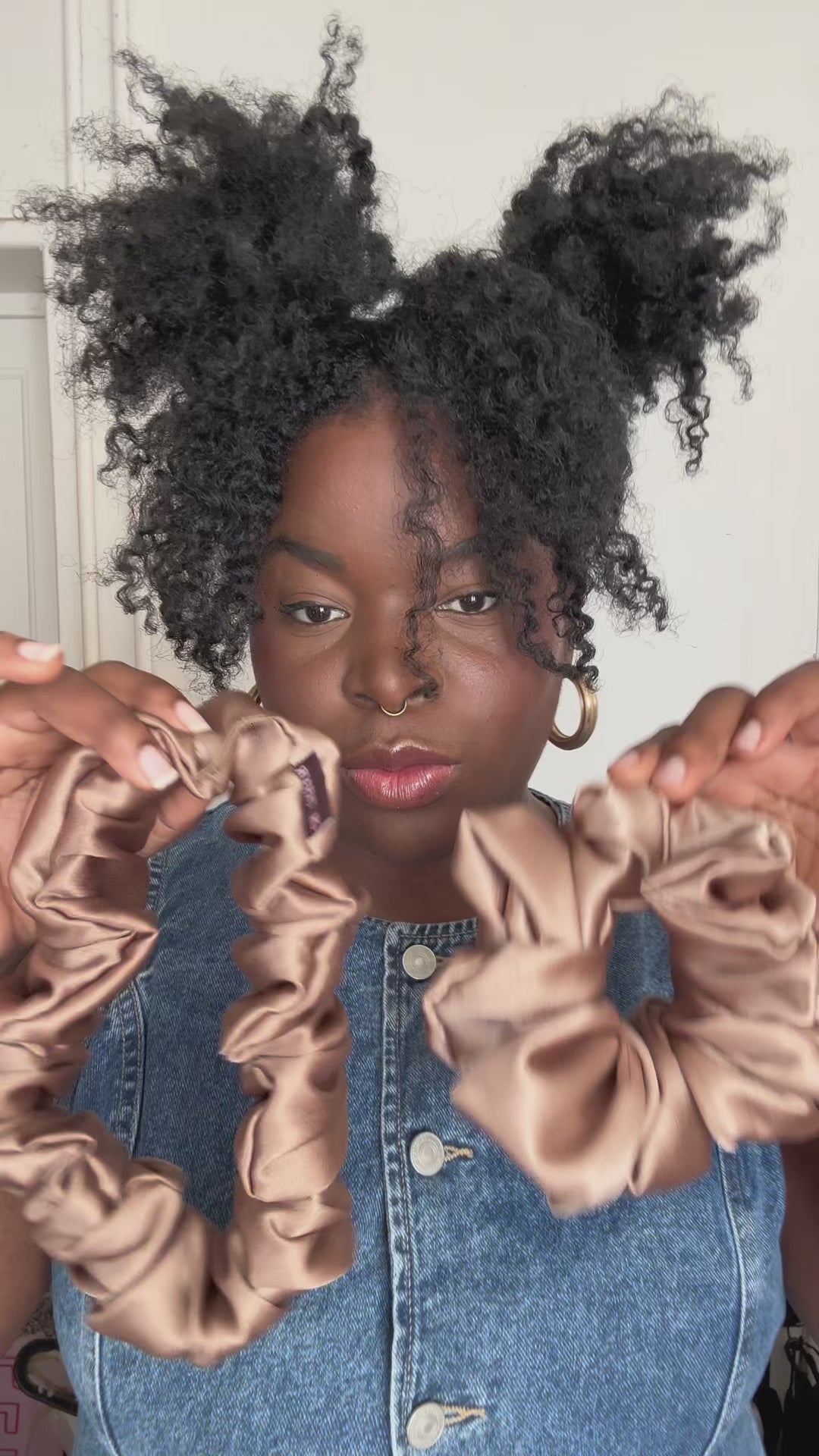 Un chouchou satiné couleur caramel doré, parfait pour sublimer tes coiffures tout en protégeant tes cheveux.