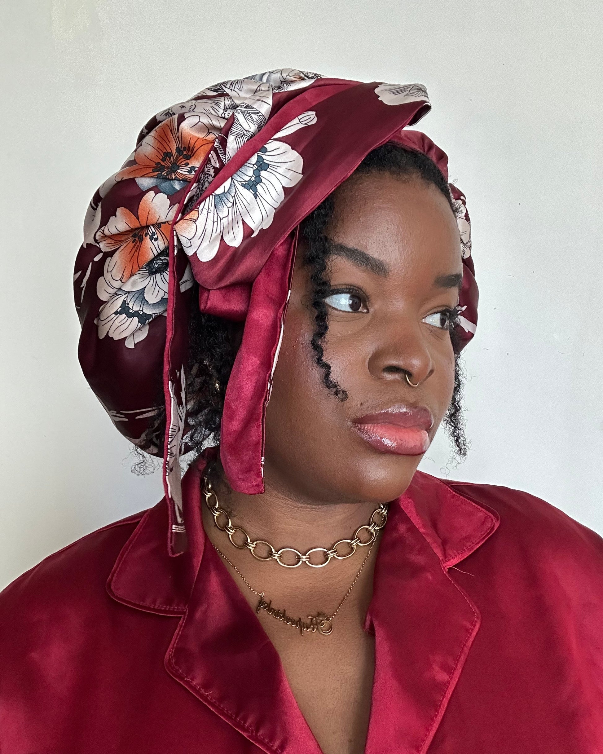 Le Bonnet Satin Burgundy allie soin et sophistication avec sa teinte bordeaux profonde et son motif floral délicat.