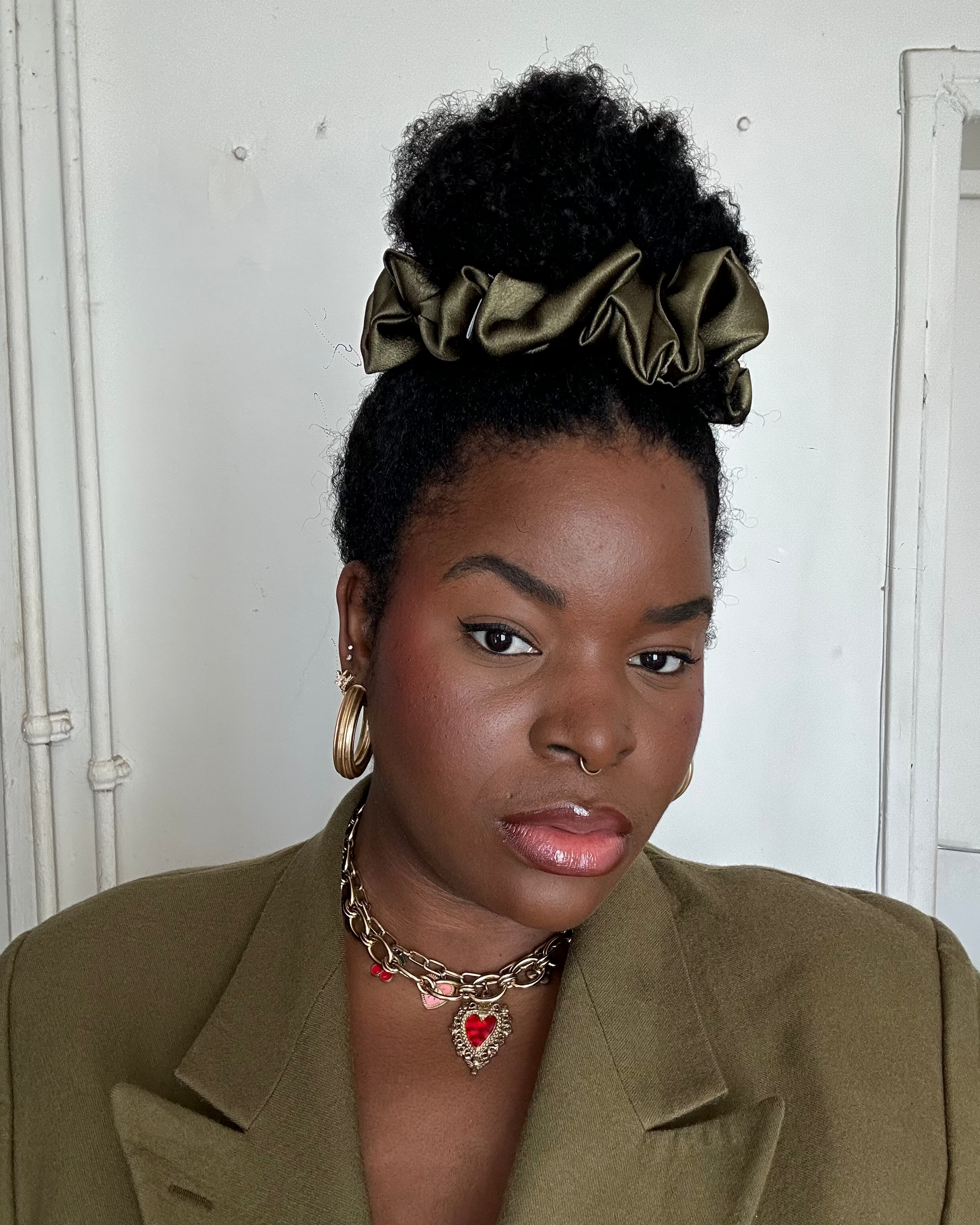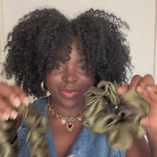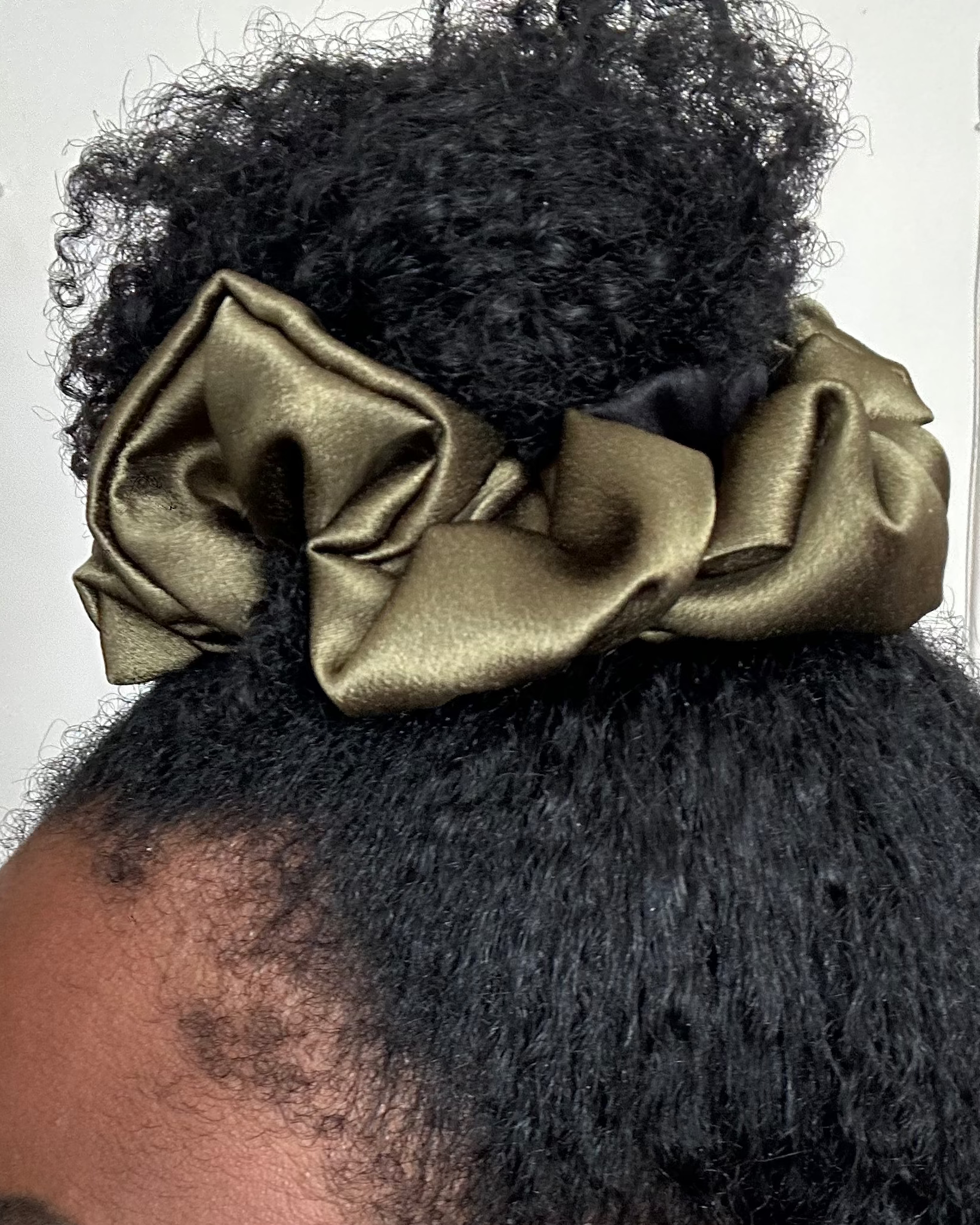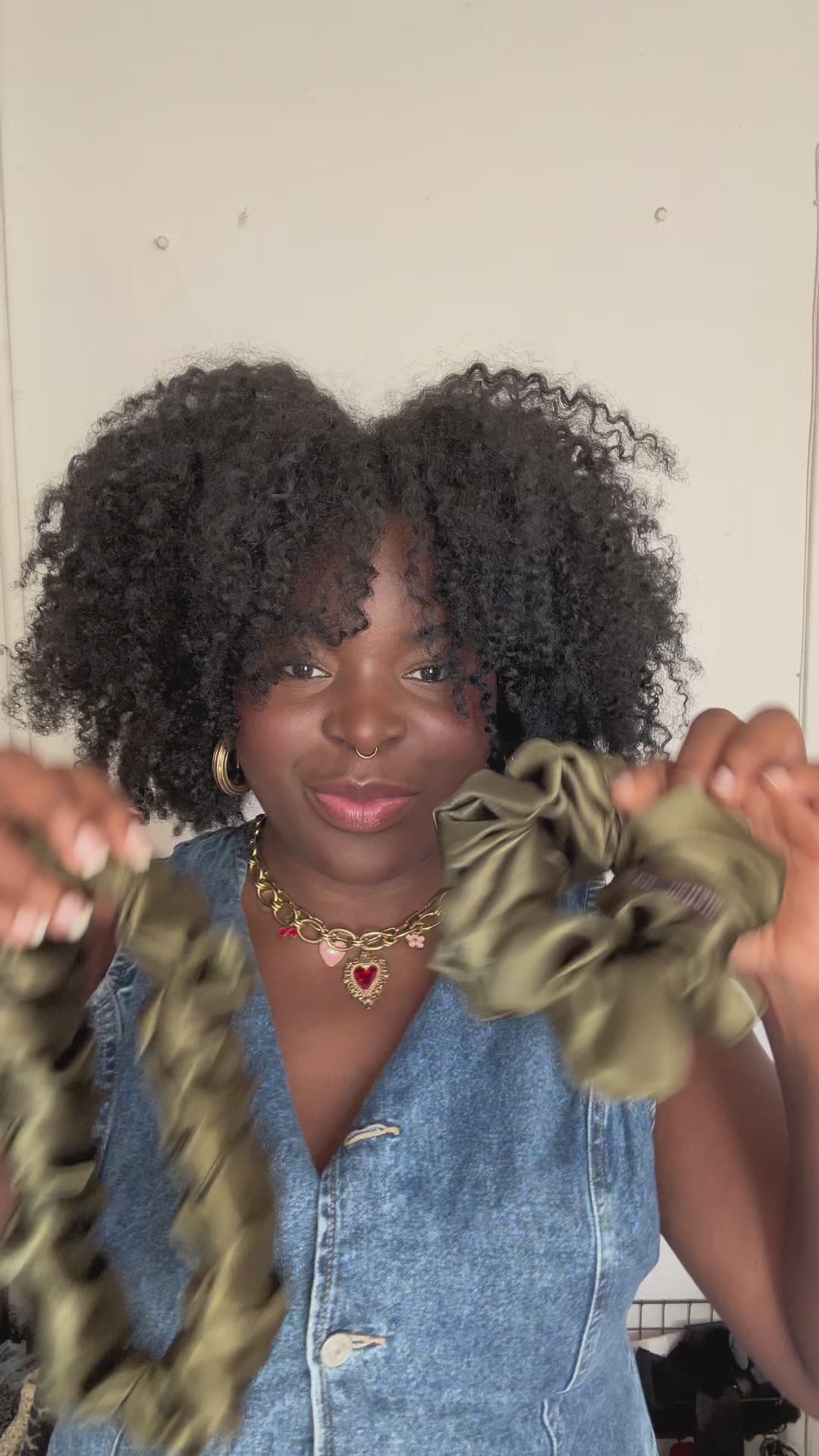 Un chouchou satiné aux reflets vert olive, parfait pour ajouter une touche élégante et apaisante à tes coiffures.